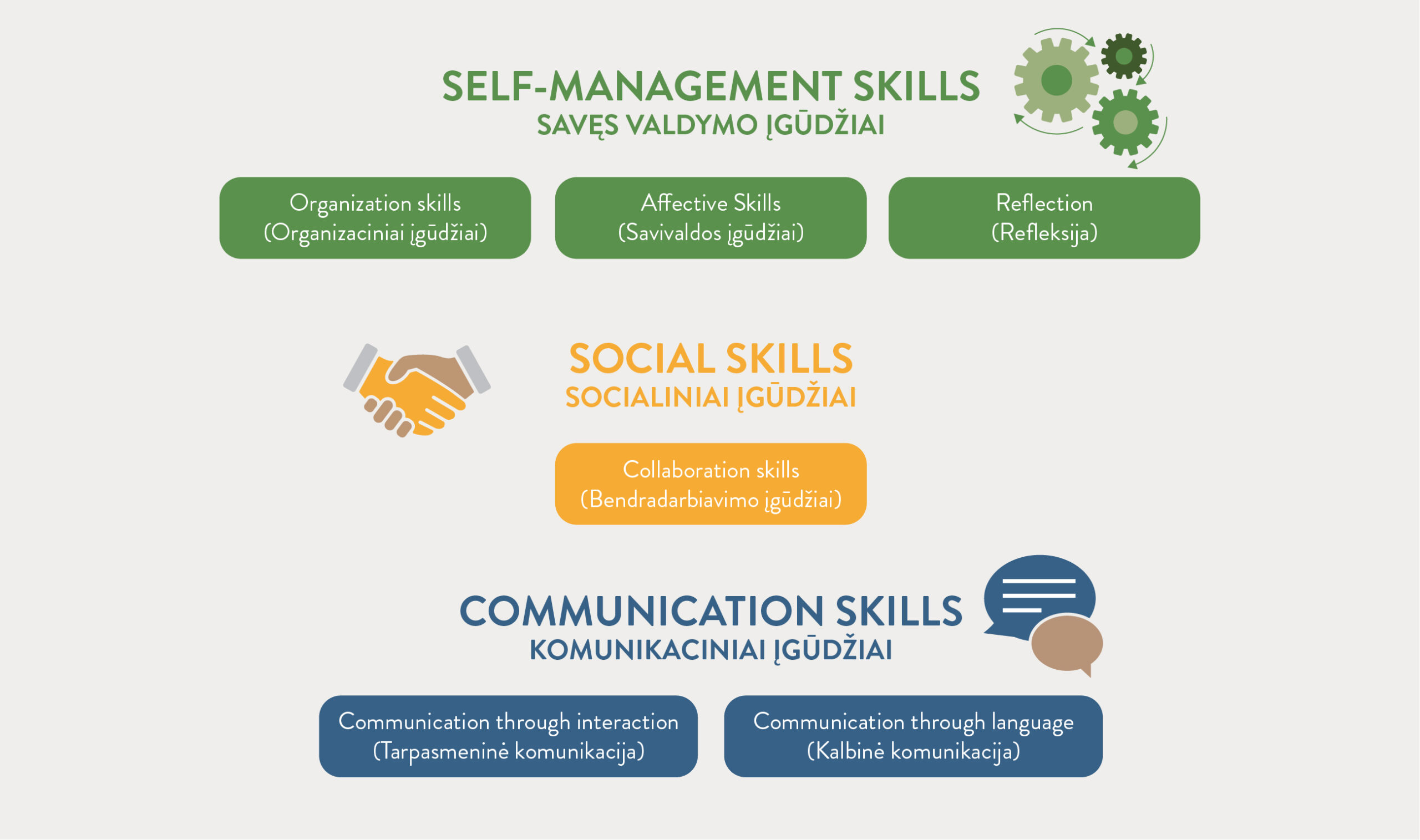 At Karalienės Mortos mokykla, we place strong emphasis on both acquiring knowledge and universal learning tools. We work with the Approaches to Learning (ATL) framework to help students become independent, learn effectively, and apply their knowledge across a variety of contexts. The International Baccalaureate identifies key groups of skills that are cultivated in all subject areas and activities. These skills equip students with the abilities necessary for success in both learning and life. They are organized into five categories:
