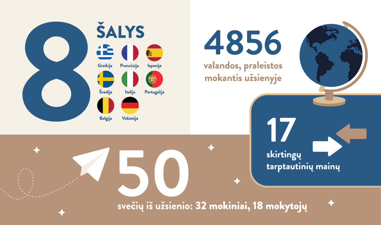Dalyvavimas tarptautinėse mainų programose, tokiose kaip Erasmus+ ir Nordplus, suteikia neįkainojamas galimybes tobulėti visiems – mokytojams, vadovams ir mokiniams. Erasmus programa skatina mokymąsi visą gyvenimą, remia žmonių išsilavinimą bei asmeninį ir profesinį augimą Europoje ir už jos ribų. O Nordplus projektas siekia kurti bendrą Šiaurės ir Baltijos šalių švietimo erdvę bei gerinti švietimo kokybę.