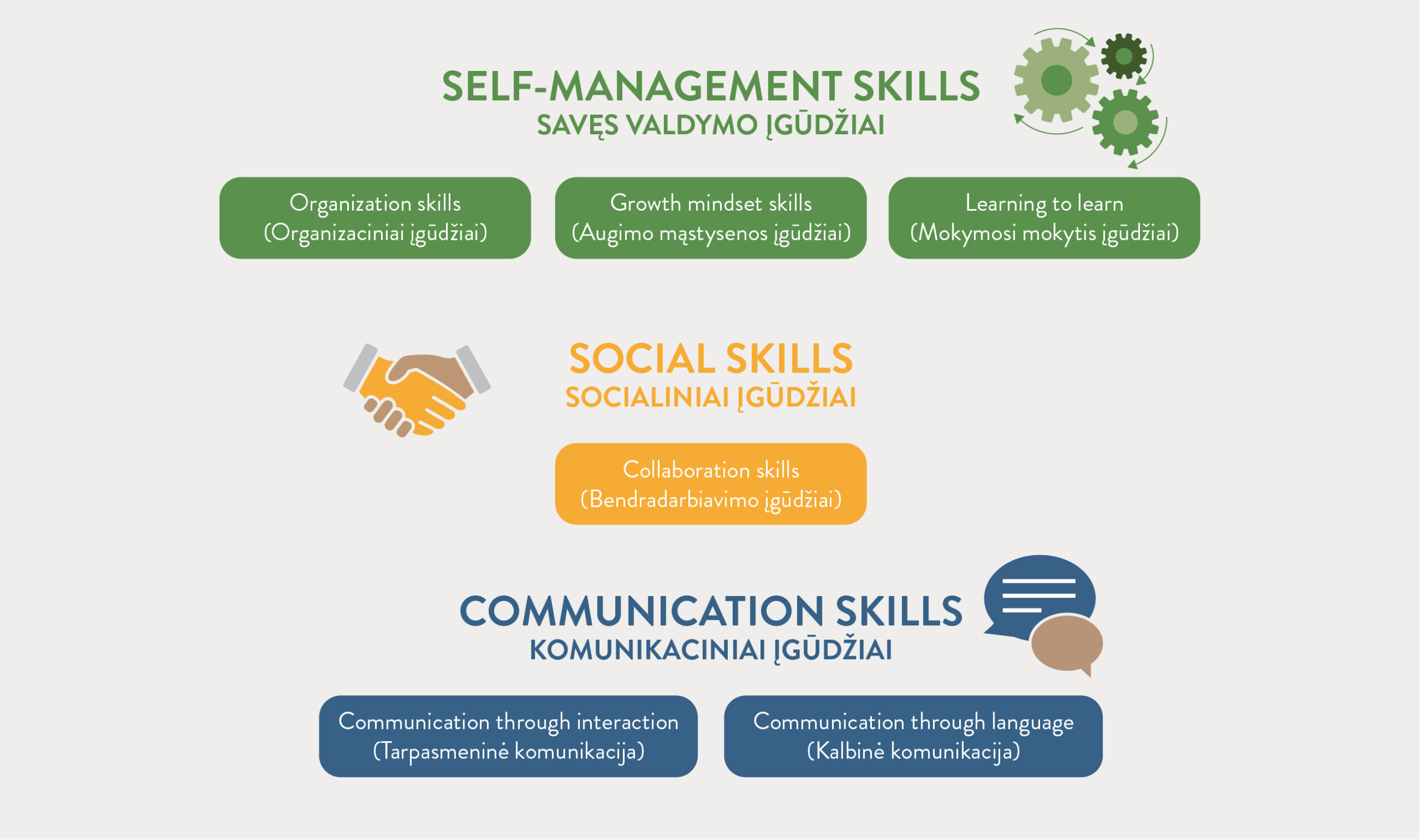 - Socialiniai gebėjimai – kaip bendradarbiauti, išklausyti kitus ir dirbti komandoje.