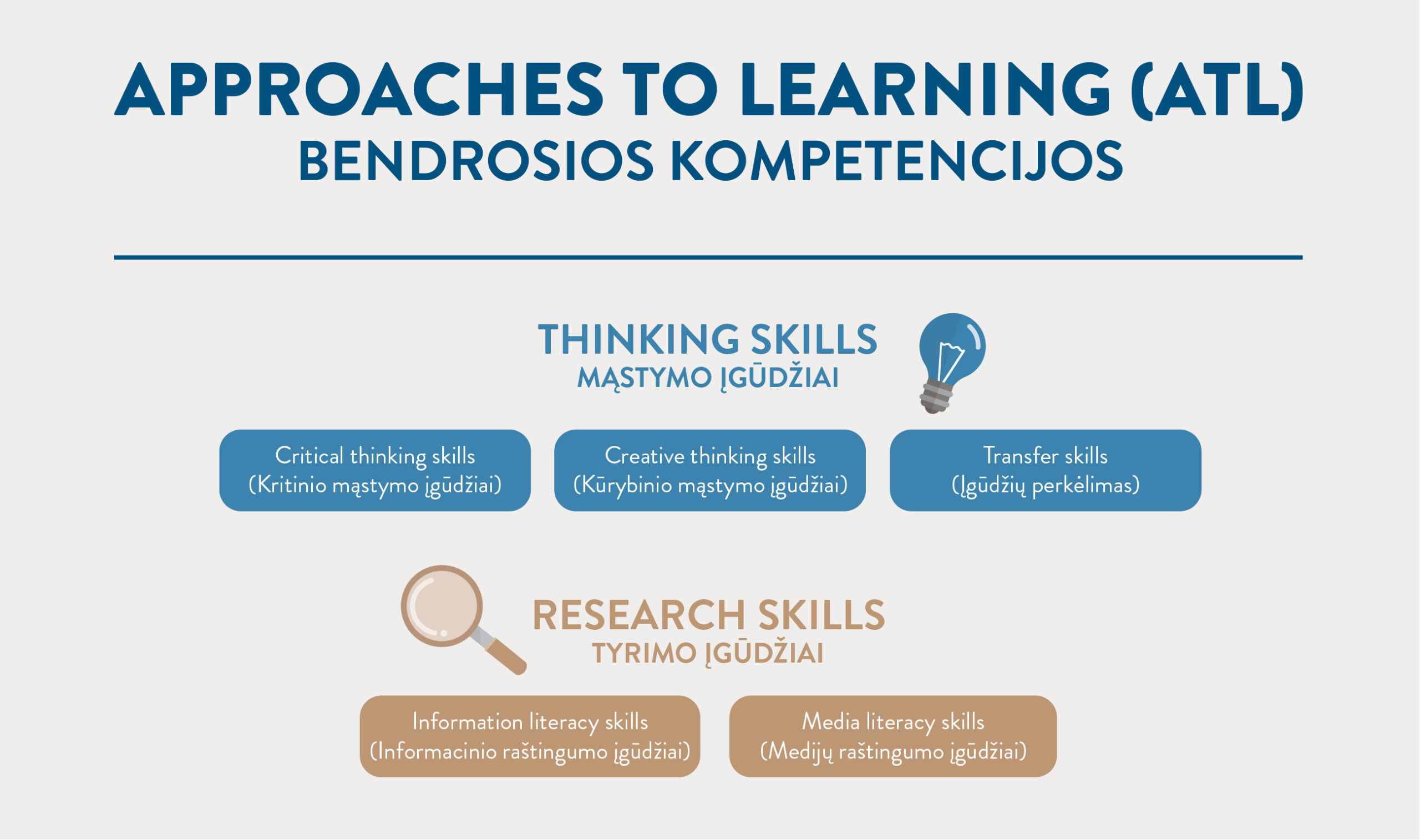 Karalienės Mortos mokykloje daug dėmesio skiriame žinioms įgyti ir kompetencijoms ugdyti. Dirbame su Approaches to Learning (ATL) modeliu, siekdami padėti mokiniams tapti savarankiškais, efektyviai mokytis ir gebėti pritaikyti žinias įvairiuose kontekstuose. Tarptautinis bakalaureatas išskiria pagrindines kompetencijų grupes, kurios yra ugdomos visose disciplinose ir veiklose. Šios kompetencijos padeda mokiniams įgyti gebėjimų, reikalingų sėkmingam mokymuisi ir gyvenimui. Jie yra skirstomi į 5 grupes: